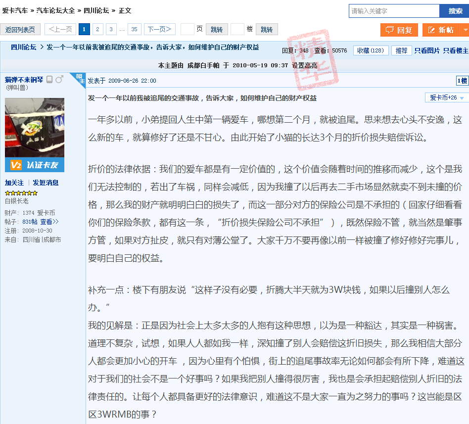 我公司一貶值損失案例在愛(ài)卡汽車(chē)四川論壇中成為精華帖??!